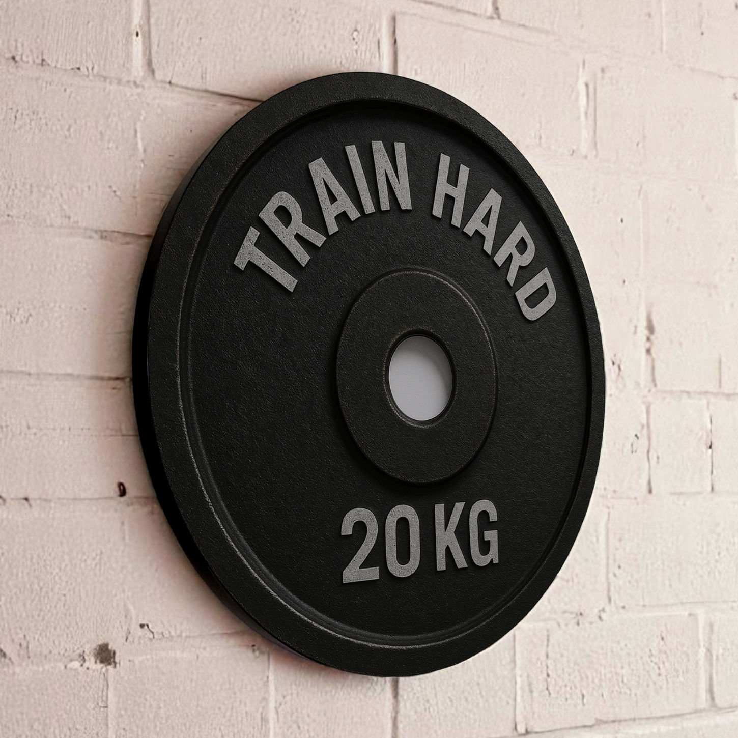 - Formato: Redondo, com arte inspirada em anilhas de 20KG
